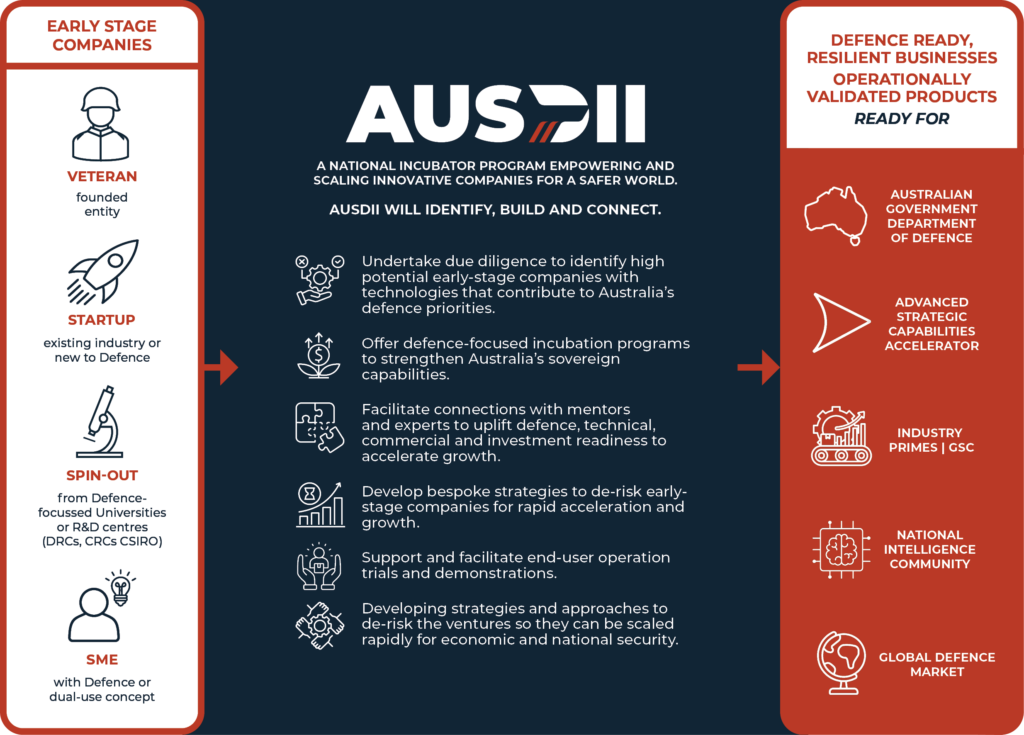AUSDII, the Australian Defence Industry Incubator, will be a not-for-profit national incubator focused on supporting, validating and scaling Australian early-stage defence and dual-use companies to transform concepts into real-world sovereign Defence capability.