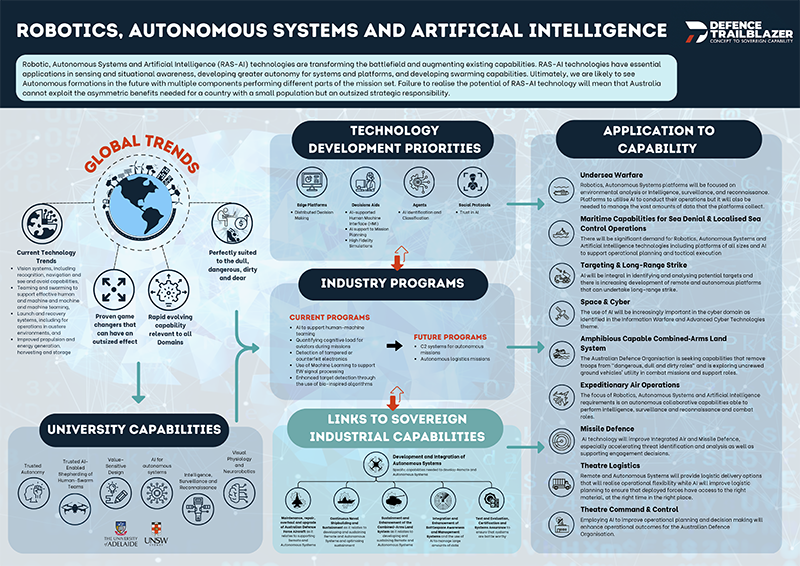 The refreshed Roadmaps detail Australia’s strategic situation and discuss the key connections and alignment with the Defence Trailblazer themes in detail. For each Priority Theme, a graphical Roadmap presents highlights of each of these information areas, providing an easily used summary to guide future activities.