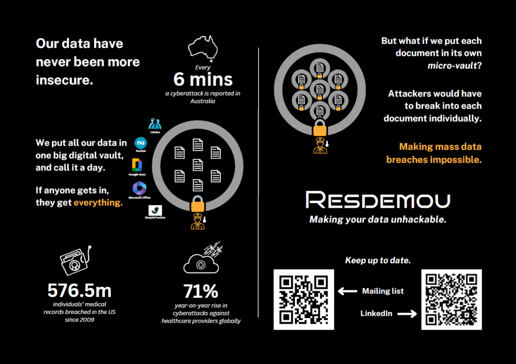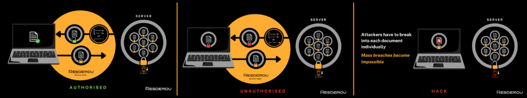 Today, organisations and government agencies put all their documents in one big digital vault, and they secure that, meaning when an attacker finds one oversight and gets in, they get everything in one fell swoop. With Resdemou, everything from documents to real-time drone feeds is independently secured in its own digital “micro-vault”, so even if an attacker gets into the main vault, they’d still have to break into every document individually, turning a network breach from catastrophic data loss into a contained and detectable incident.